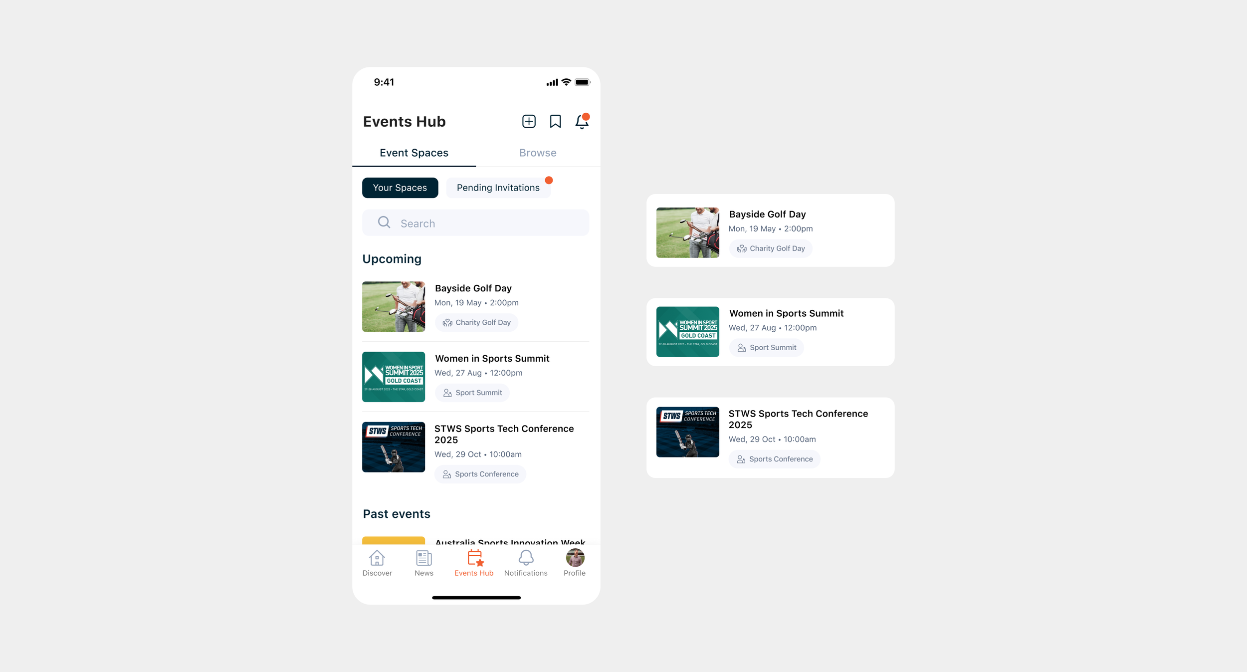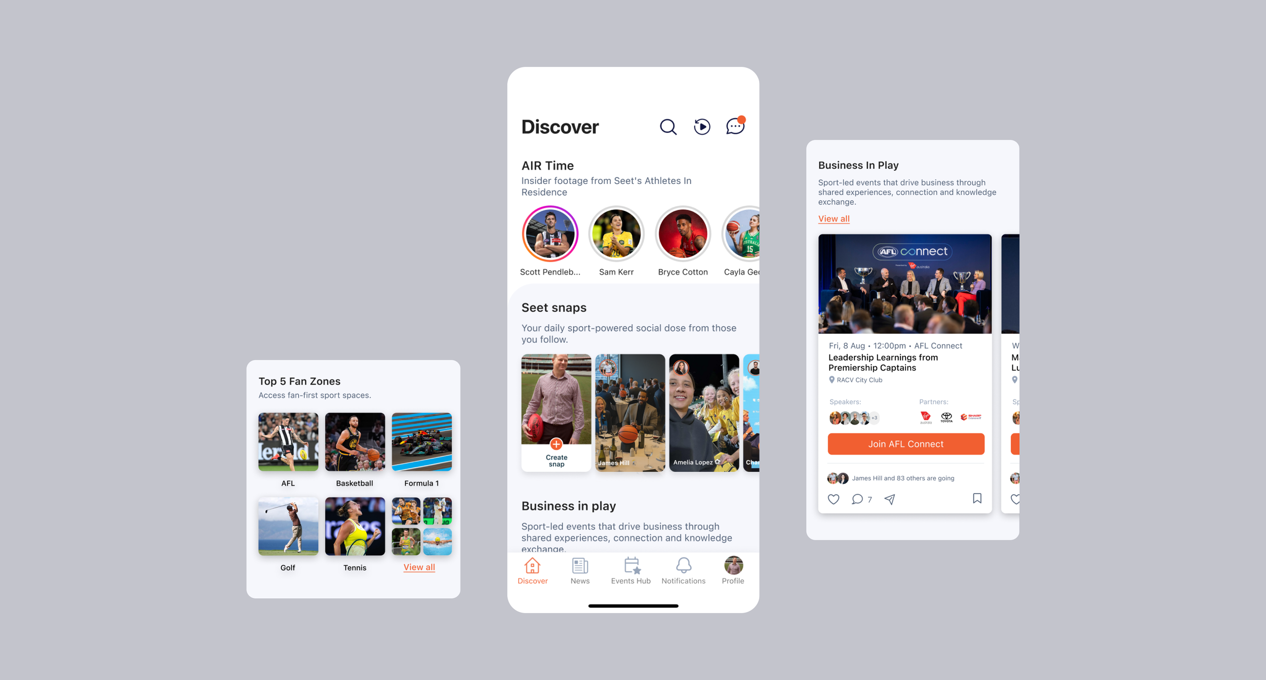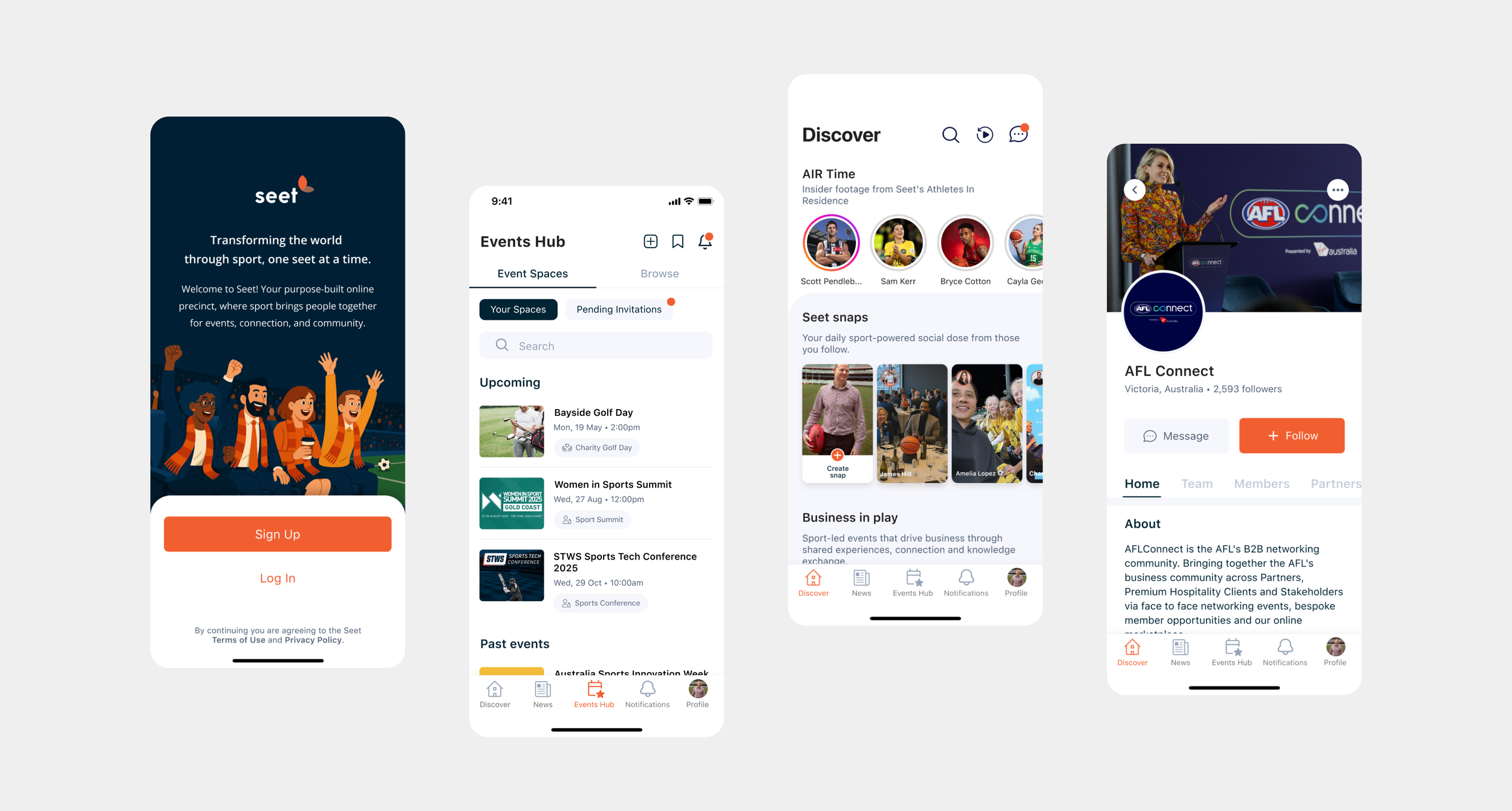 Seet is a platform designed to bring together professionals, enthusiasts, athletes and fans around sporting events, offering a space to discover events, connect with like-minded people, and grow their networks. The client needed a set of UI designs that could be used to pitch the concept to potential partners and investors. My role was to take the brief and translate it into a clean, engaging interface that reflects the energy and community of sports.